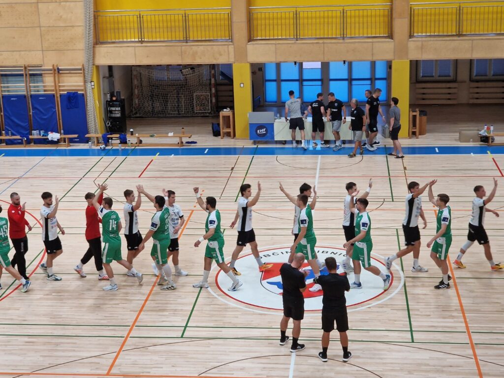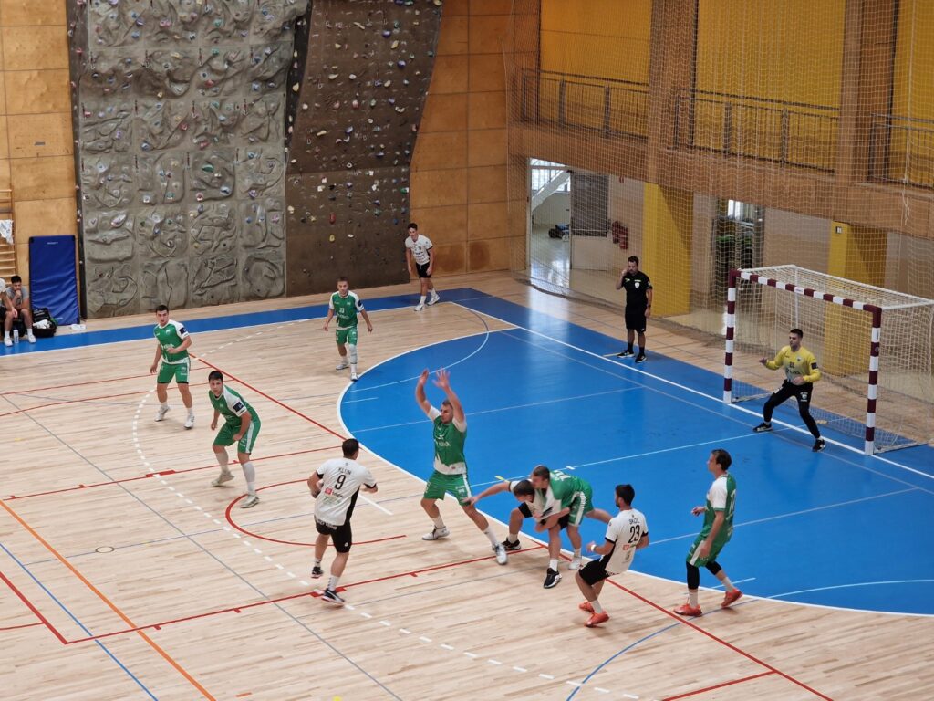 Krkaši so že od uvodnih minut prevzeli pobudo. Po prvih 15 minutah so vodili s 7 : 10, v naslednjem delu prvega polčasa pa so svojo prednost povečali na 12 : 17 (drugi 15-minutni odsek 4 : 7 za Krko). Obramba je bila čvrsta, vratarja pa sta prispevala nekaj ključnih obramb.